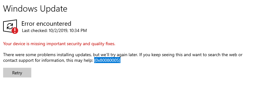 Discus and support Can't update windows no matter what. Error code 0x80080005 in Windows 10 Installation and Upgrade to solve the problem; I have tried everything. Newer pc, windows 10, rtx 2070. amd ryzen 5. About 5 months ago my windows update started having errors when searching for... Discussion in 'Windows 10 Installation and Upgrade' started by KeiPorter, Feb 15, 2020.