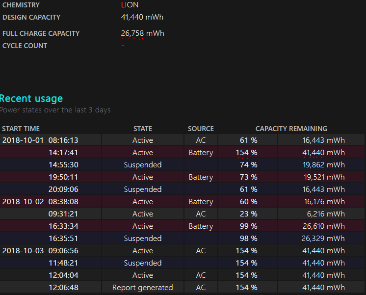 in Windows 10 Drivers and HardwareInterpreting a Battery Health Report: Full Charge Capacity Exceeds Design Capacity: Before purchasing a replacement battery for my PC, I ran a Battery HealthReport because the battery on my laptop will no longer power it for more than afew minutes. My question about the report relates to the "Battery CapacityHistory" section. For my PC the Full Charge... -