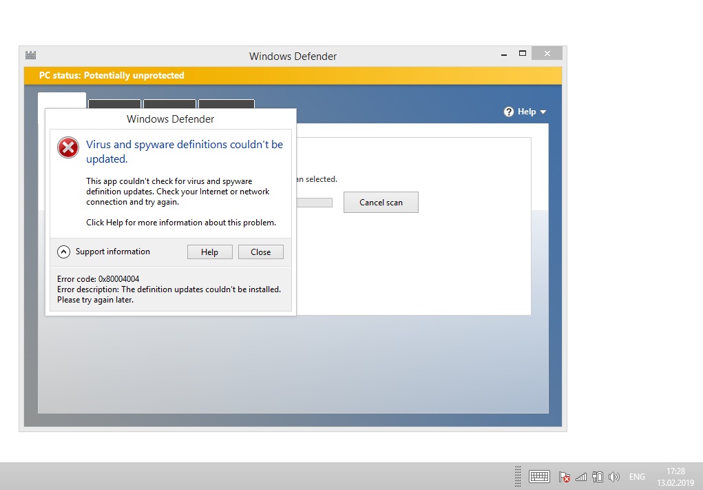 Virus and spyware definitions could be updated on windows defender error code 0x80004004