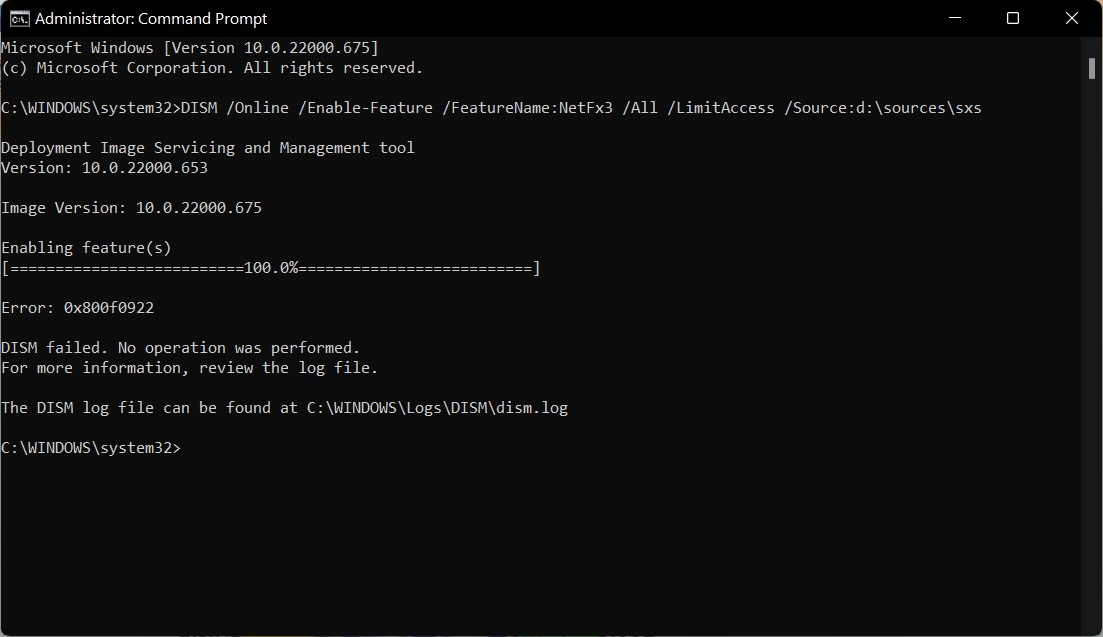 error code 0x800f0922 trying to install net framework 3.5 windows 11 home