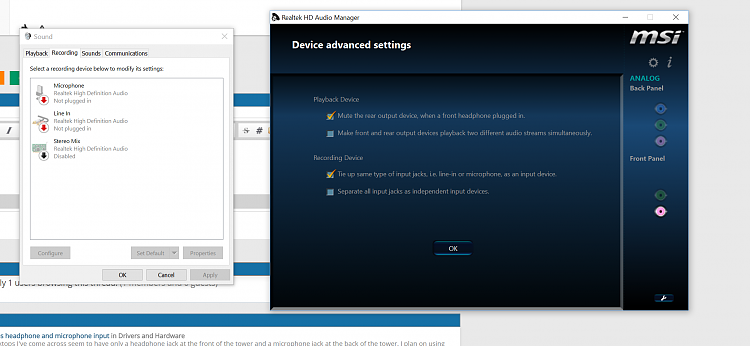 Discus and support How to use microphone plug as a mic and a headphone? in Windows 10 Software and Apps to solve the problem; Hello, recently I accidentally broke my headphone jack on the top of my PC because I walked away from the computer. Due to this, the headphone jack... Discussion in 'Windows 10 Software and Apps' started by Sunghoon Yi, Apr 26, 2024.