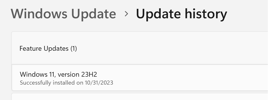 in Windows 10 Software and AppsWindows 11 23H2 Build 22631.2506 released to the public.: Windows 11 23H2 released to the public.October 31, 2023—KB5031455 OS Builds 22621.2506 and 22631.2506 Preview - Microsoft SupportWindows 11, version 23H2 update history - Microsoft Support... -