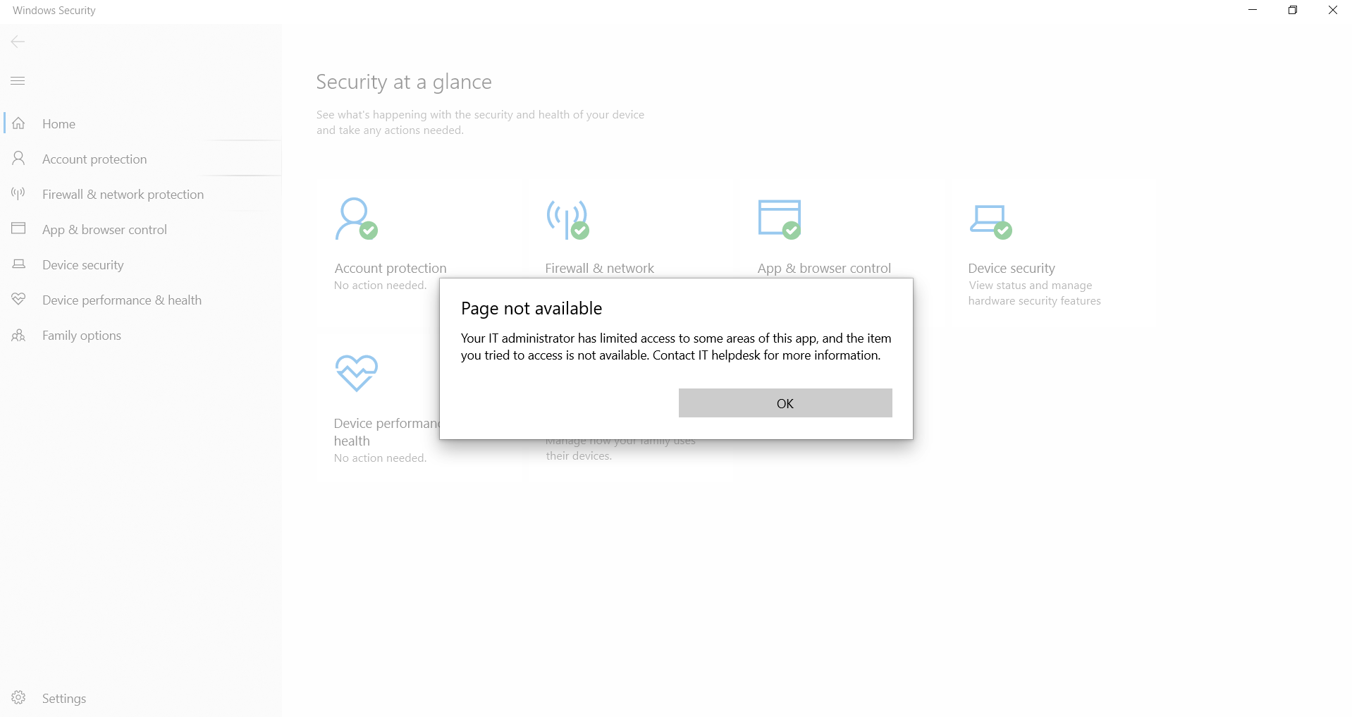in Windows 10 GamingPage not available virus threat protection: page not available your administrator has limited access to some areas of the app virus threat protection https://answers.microsoft.com/en-us/windows/forum/all/page-not-available-virus-threat-protection/eab26b5c-8f92-42d3-be92-cfd288f28977 -