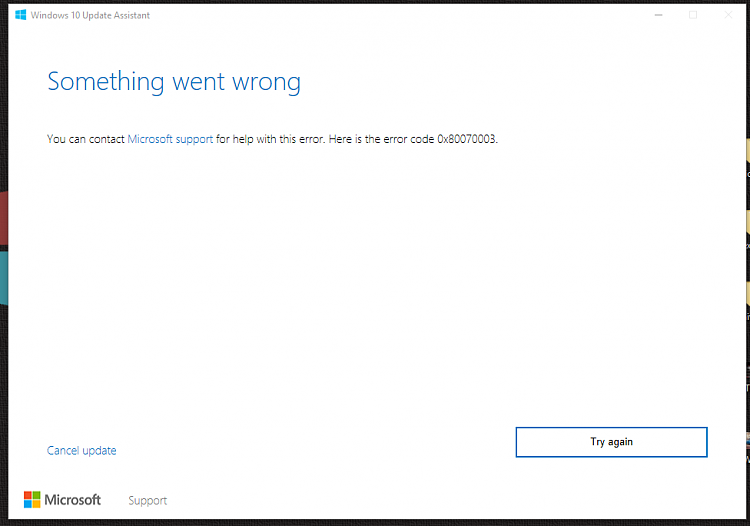 Discus and support Trying to upgrade to Windows 11. Error 0x80070003 in Windows 10 Software and Apps to solve the problem; I have been trying to upgrade my Windows 10 PC to Windows 11. Every time I attempt the upgrade, I get the error message “Some update files are missing... Discussion in 'Windows 10 Software and Apps' started by JakeBiel, Jul 13, 2024.