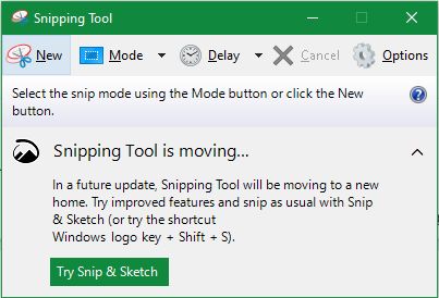 in Windows 10 CustomizationSnipping Tool - Automatically do a 'New' when the app is started.: Microsoft, please update Snipping Tool so that it can be configured to automatically do a 'New' when the app is started? I frequently use the Snipping Tool. Please add an option to configure the tool so that when I start the app it will automatically do the 'New' function?...